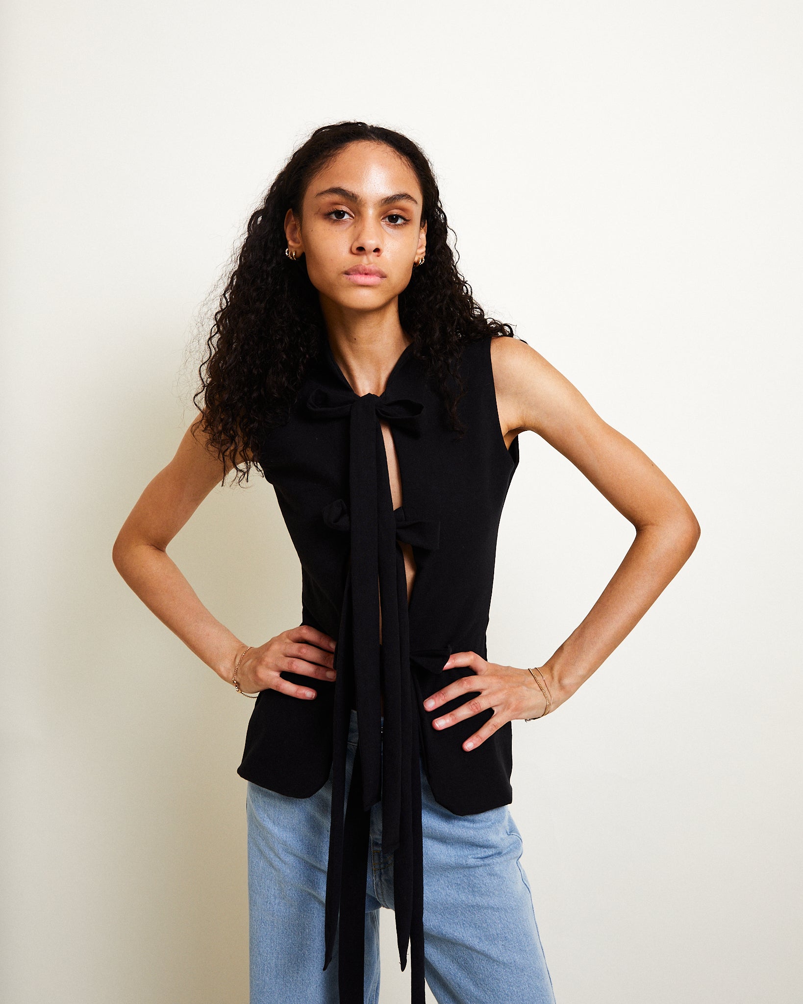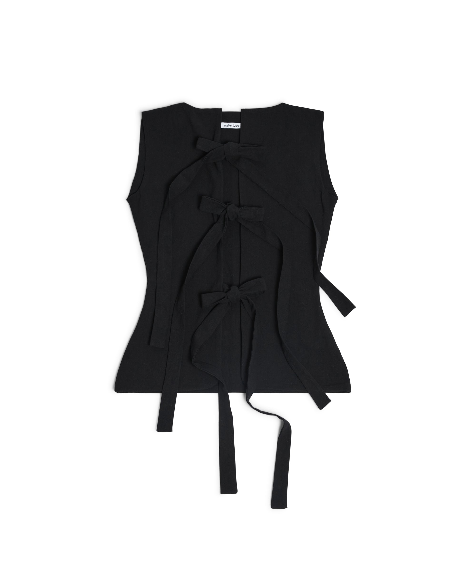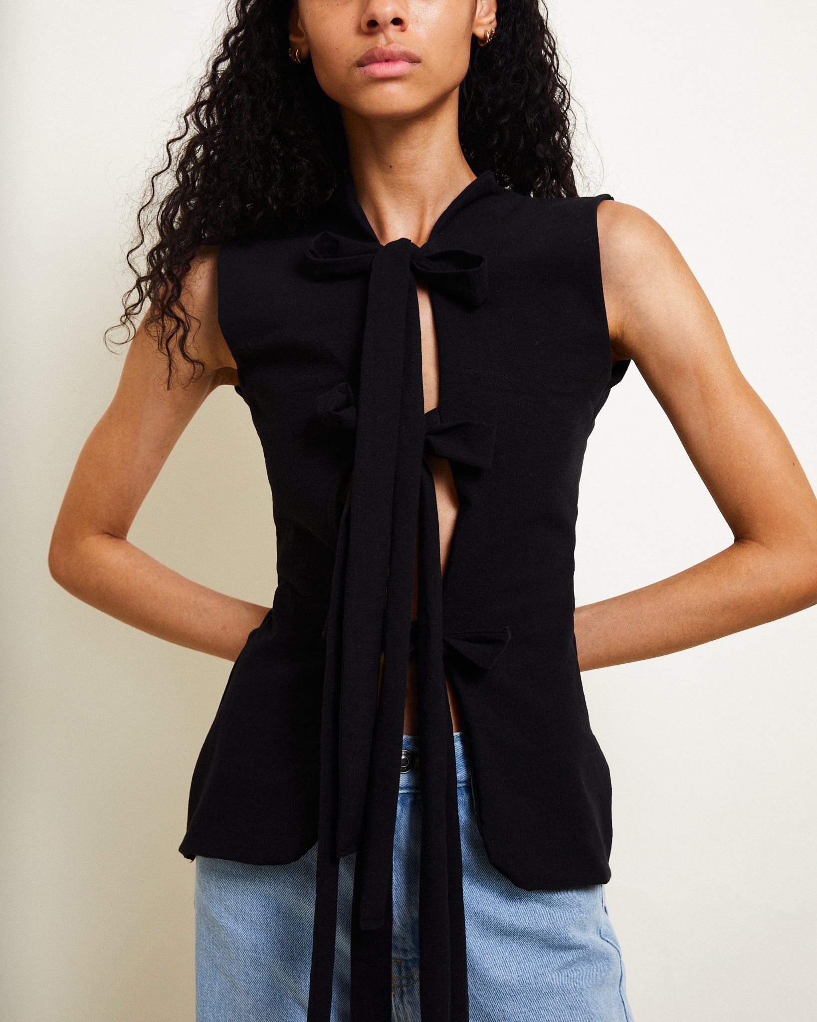 The Bowtie Vest is our signature form-fitting top, handmade in small batches in Vancouver, Canada. She is double-lined and features three bows down the centre that can be worn front or back, and adjusted to your comfort.