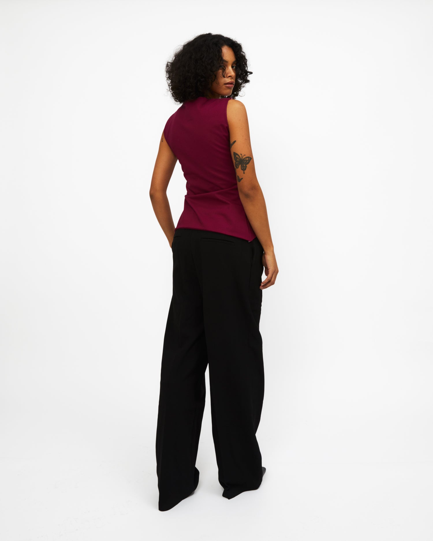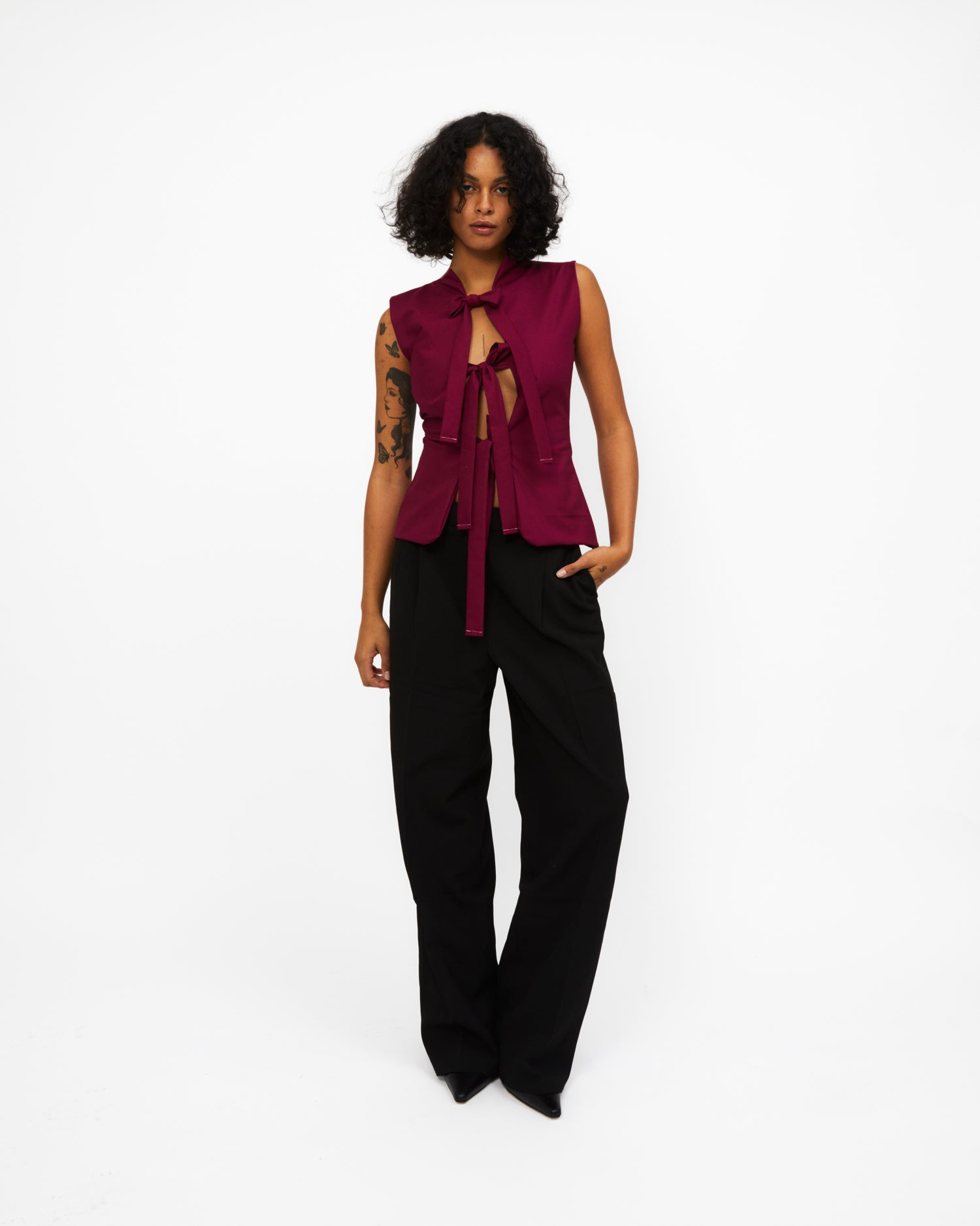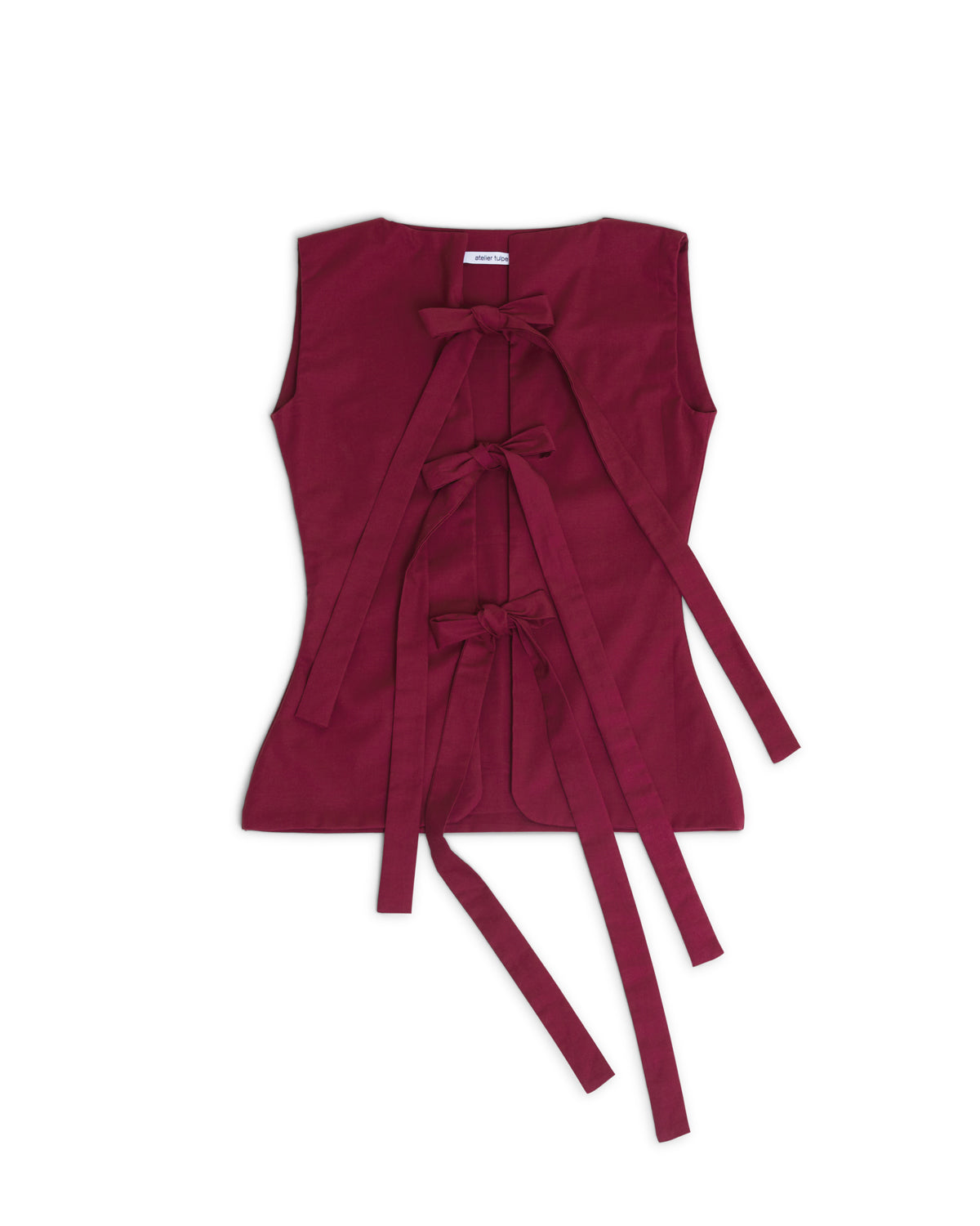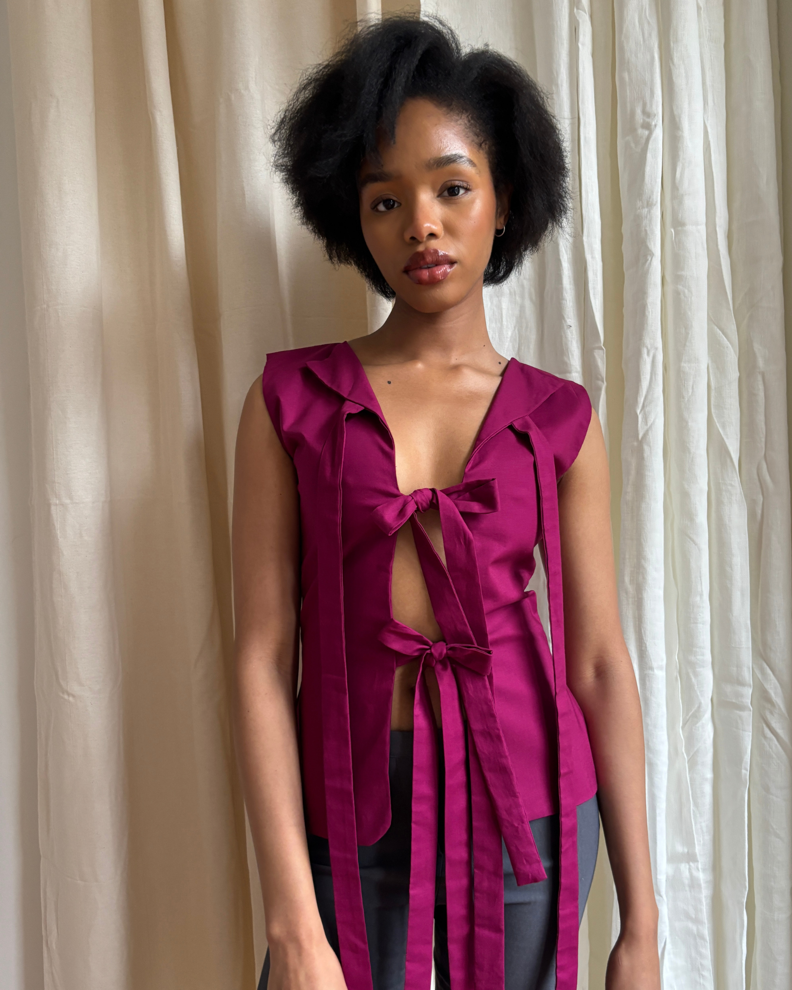 The Bowtie Vest is our signature form-fitting top, handmade in small batches in Vancouver, Canada. She is double-lined and features three bows down the centre that can be worn front or back, and adjusted to your comfort.