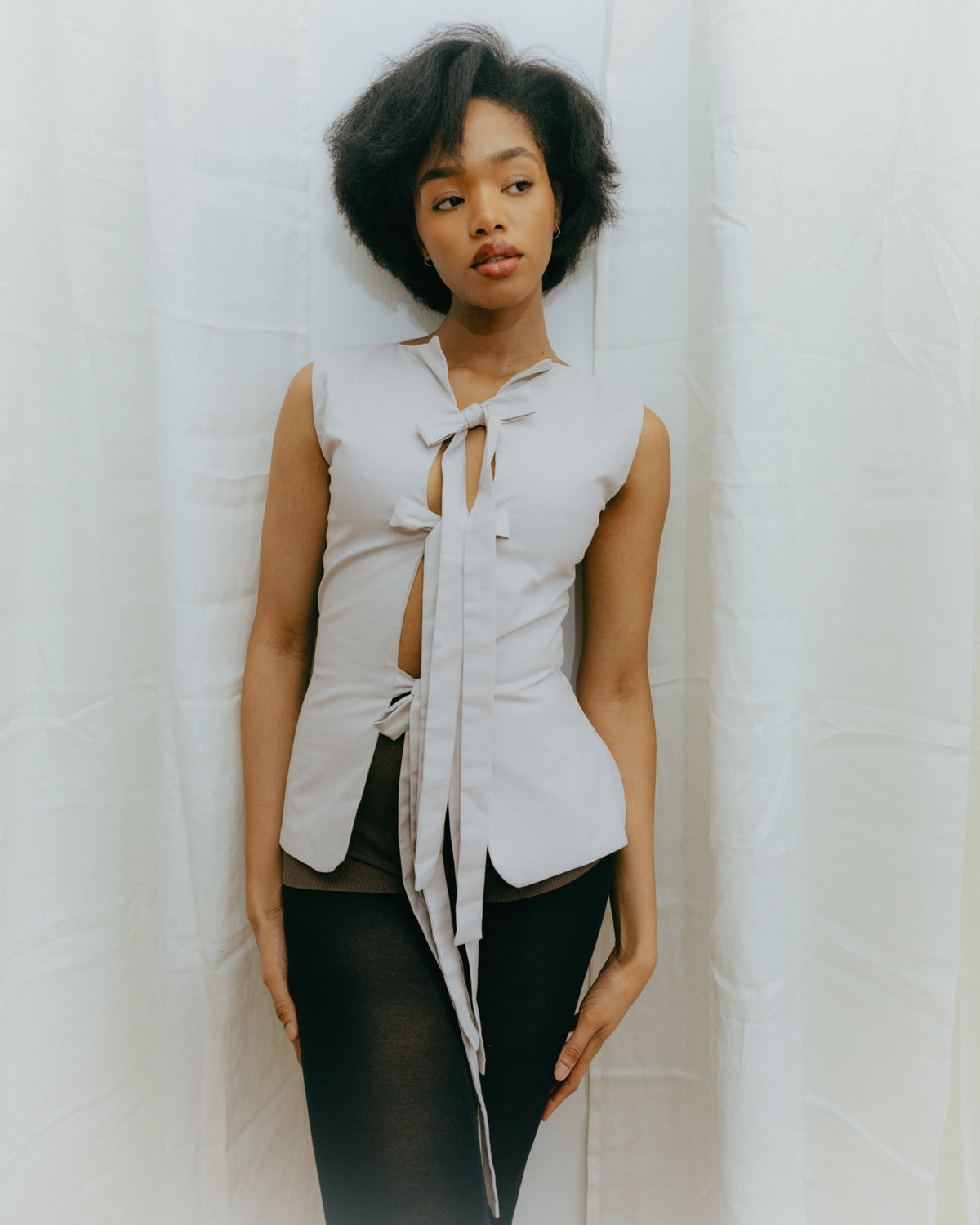 Our signature form-fitting top, The Bowtie Vest is made in small batches in Vancouver, Canada. She is double-lined, reversible, and features three bow ties down the centre that can be adjusted to your comfort.