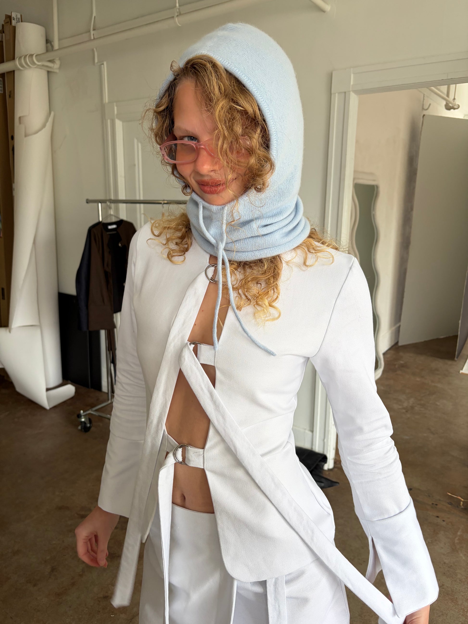 A new iteration of our Longsleeve Bowtie Vest — our most loved silhouette. Lined with cotton sateen, the figure is accentuated where hardware holds straps in place. Slightly flared sleeves elongate the arms and are complete with a slit cuff for added practicality.